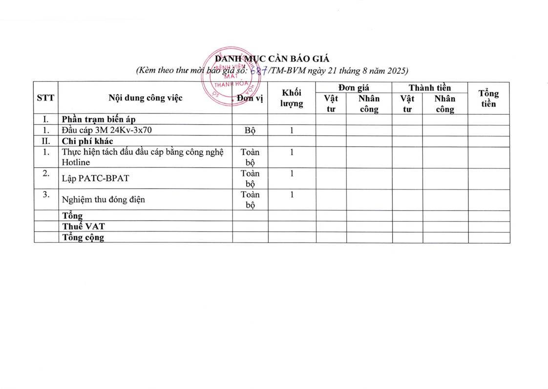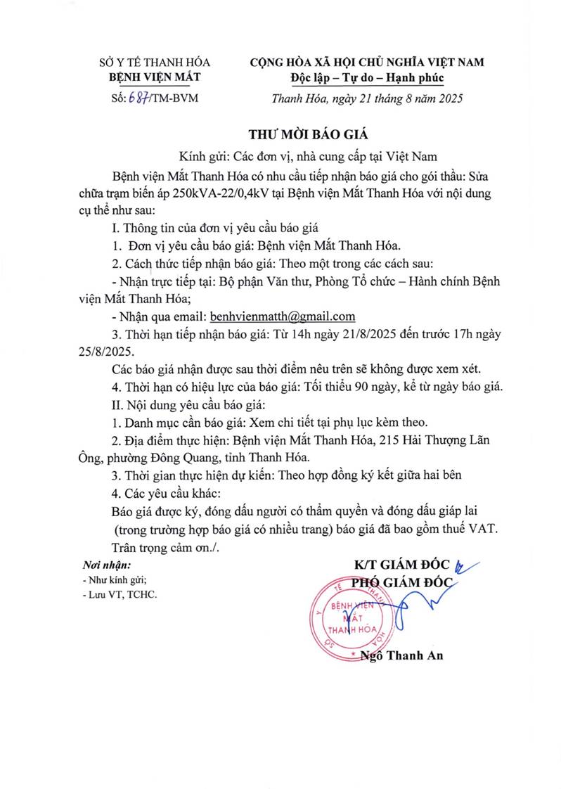 - Thư mời báo giá cho gói thầu sửa chữa trạm biến áp