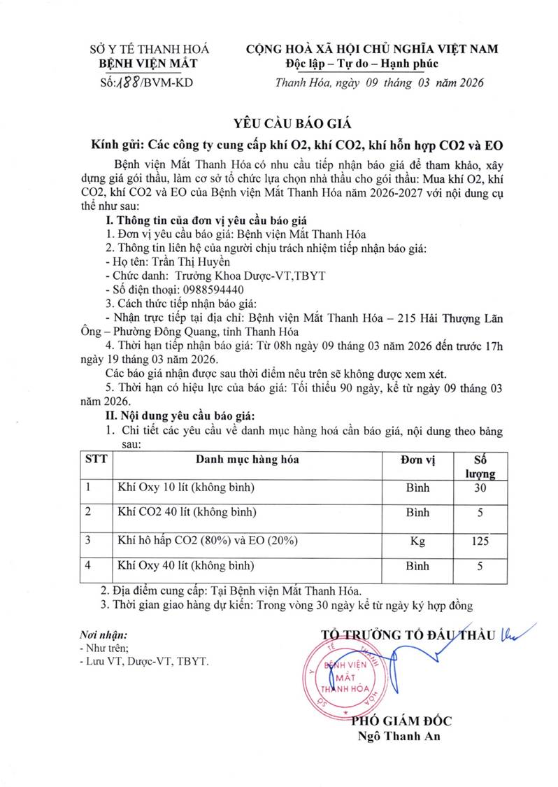 - Yêu cầu báo giá cho gói thầu mua khí O2, khí CO2, khí CO2 và EO