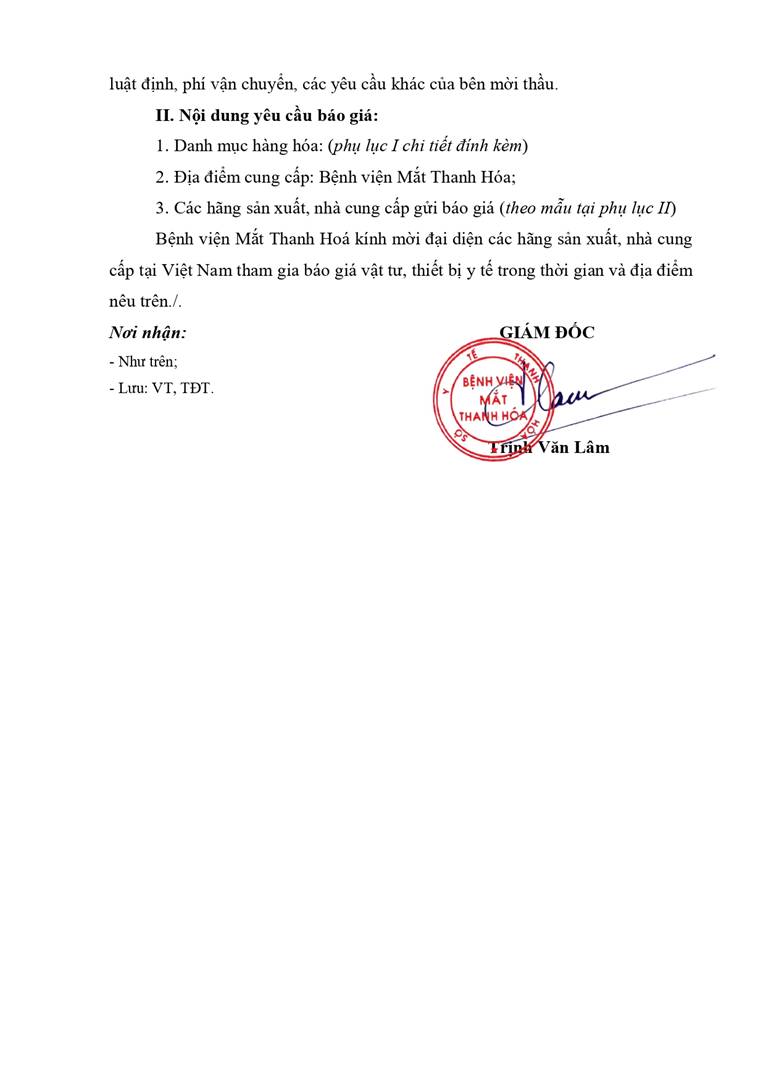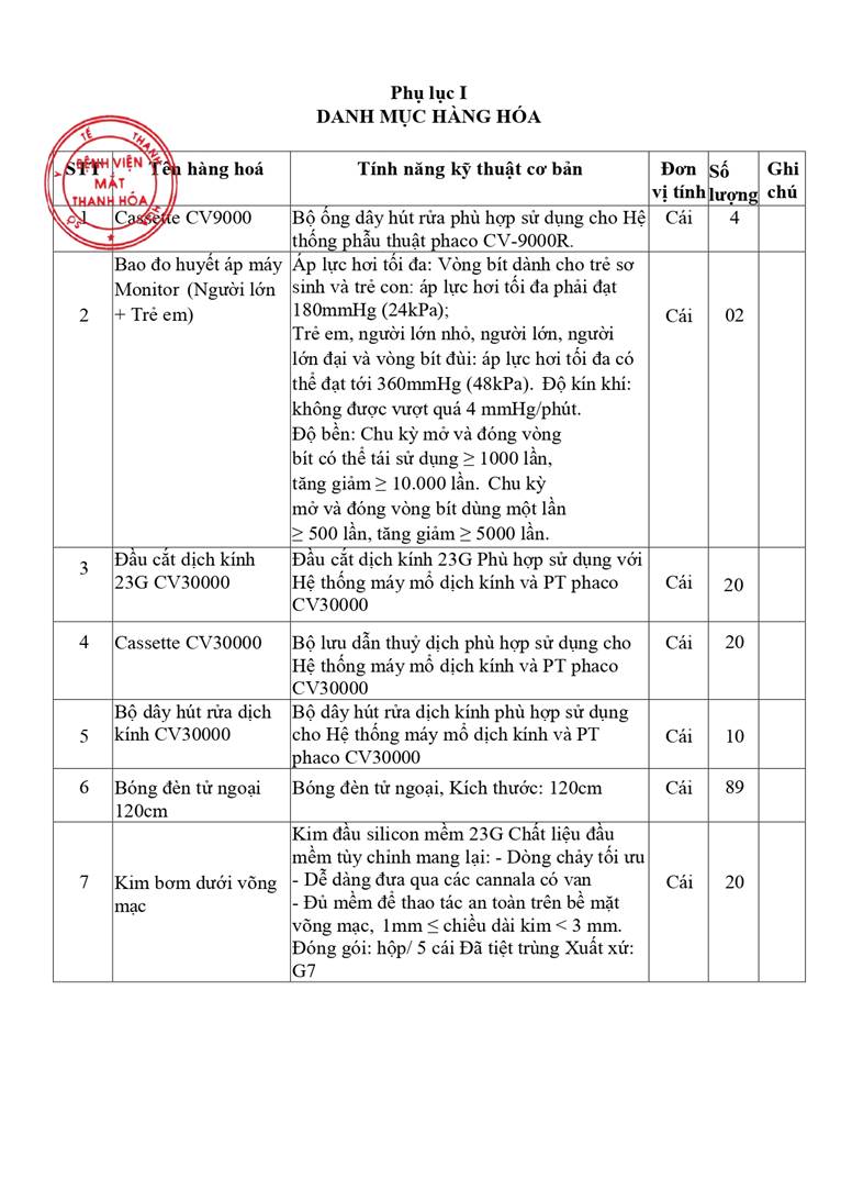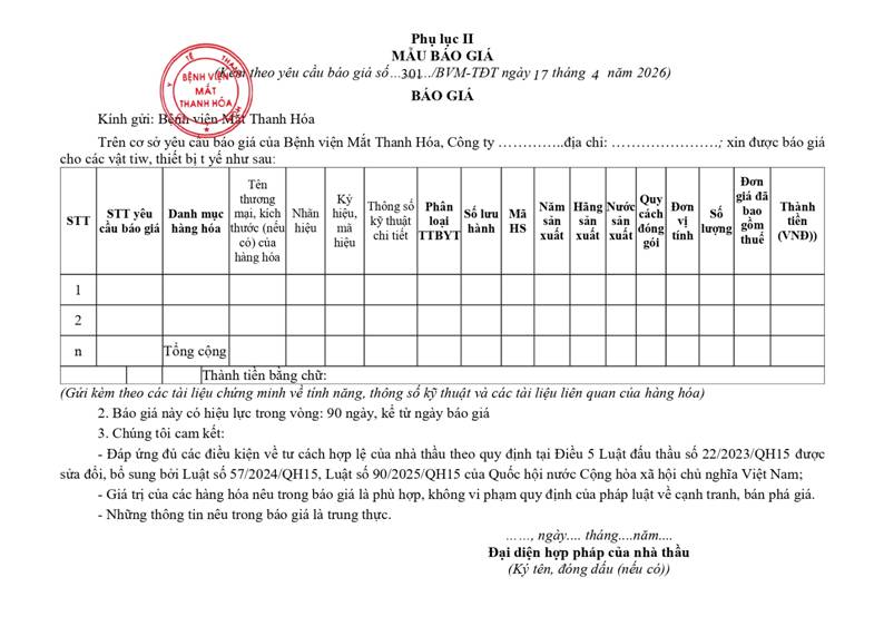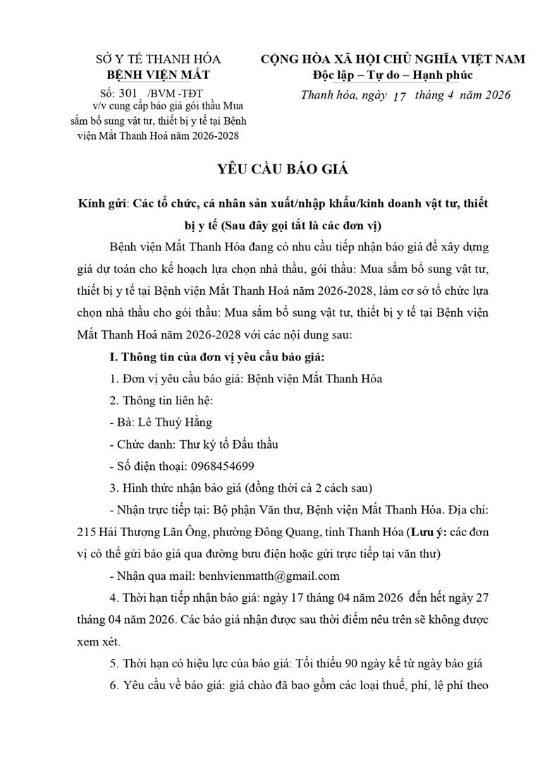 - Yêu cầu báo giá cho gói thầu mua sắm bổ sung vật tư, thiết bị y tế tại Bệnh viện Mắt Thanh Hoá năm 2026-2028