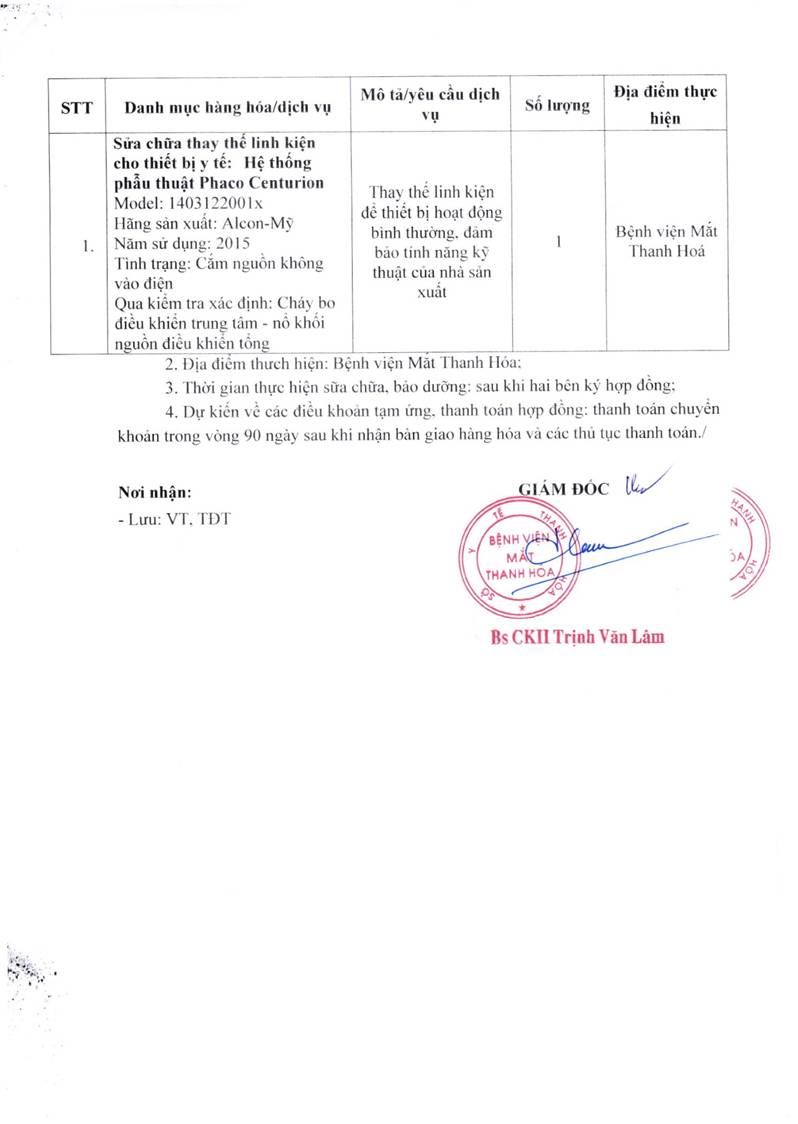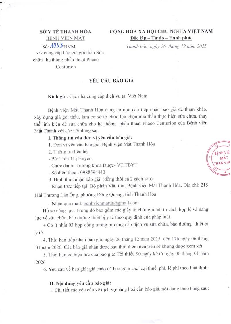 - Yêu cầu báo giá cho gói thầu sửa chữa hệ thống phẫu thuật phaco Centurion