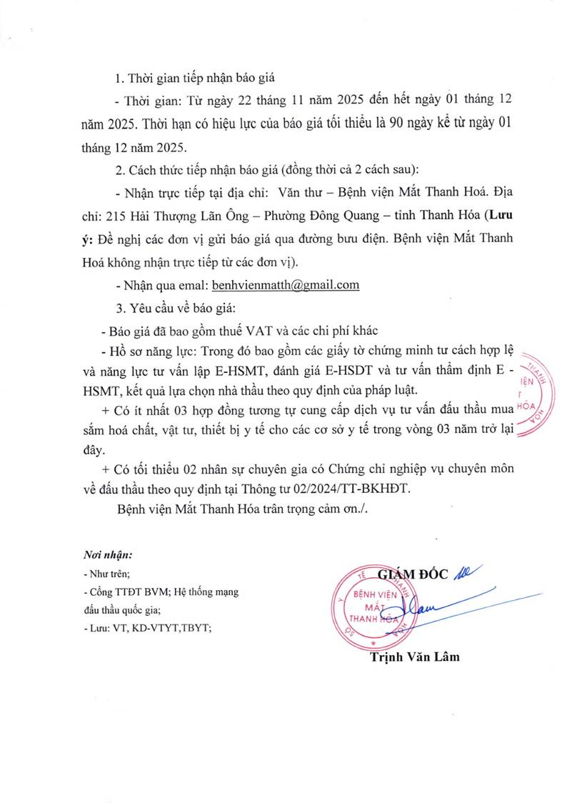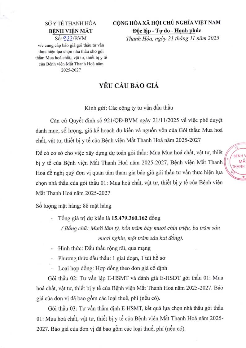 - Yêu cầu báo giá cho gói thầu Mua sắm thuốc sử dụng tại Bệnh viện Mắt Thanh Hoá năm 2025-2027